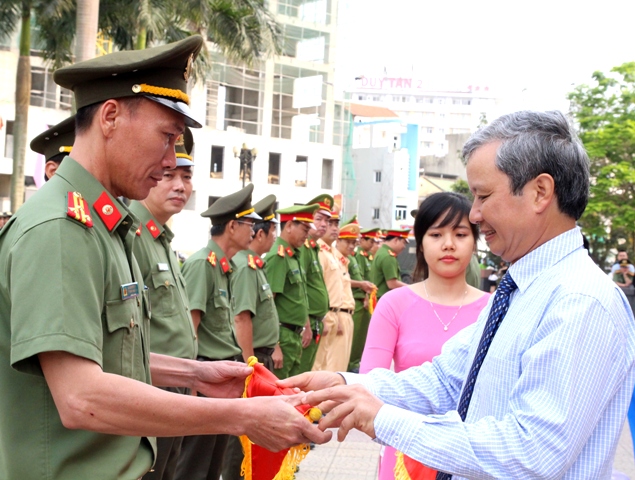 Secretary of Provincial Party Committee, Mr. Le Truong Luu gives souvenir flags to the units