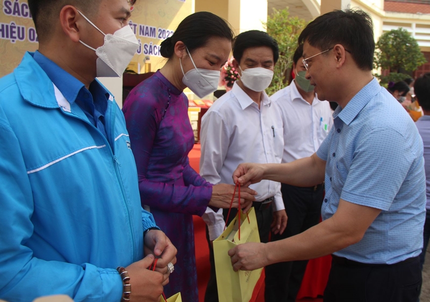 | Mr. Nguyen Thanh Binh, the Standing Member of the Provincial Party Committee, Permanent Vice Chairman of Provincial People's Committee, on an occasion to present the publications of Hue Bookcase to schools |