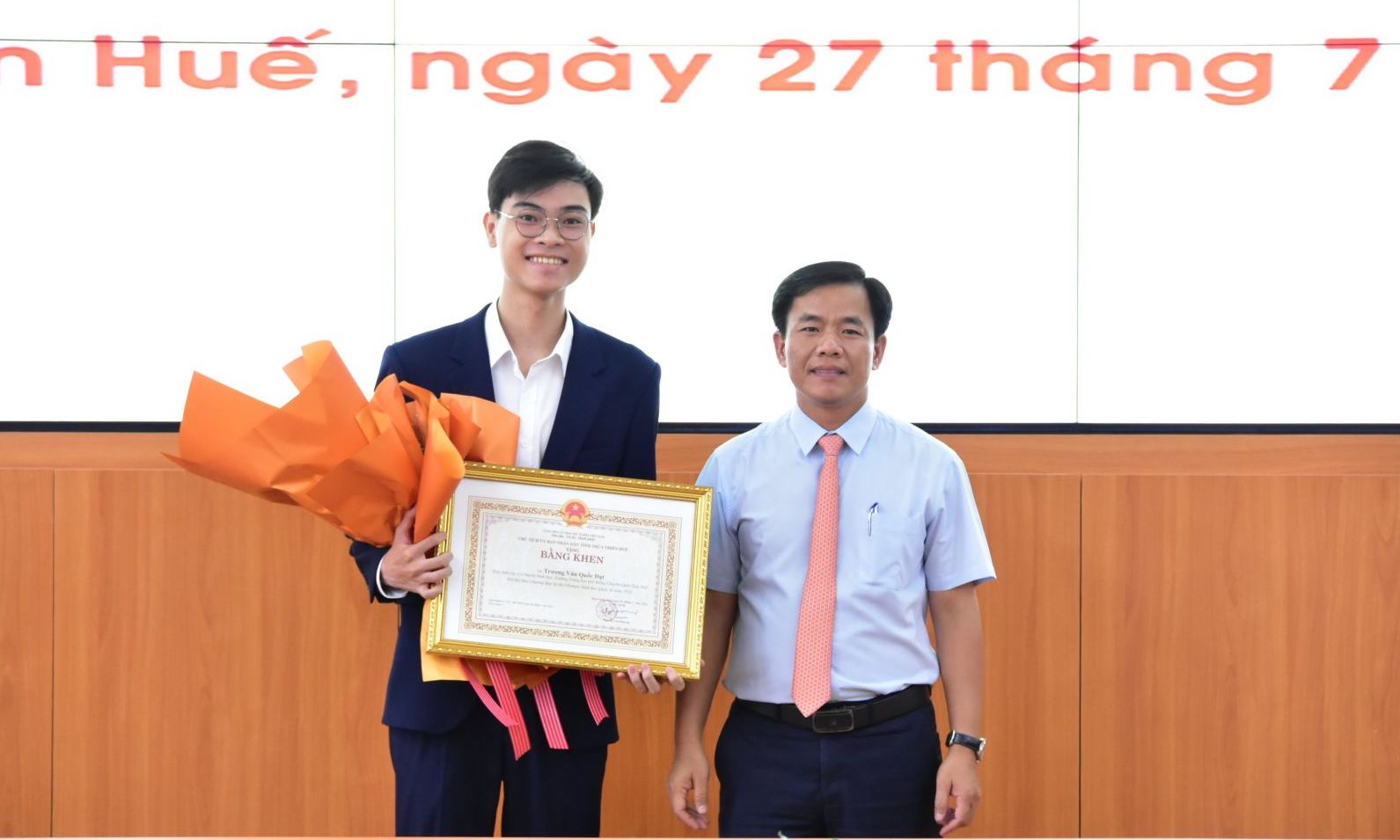 At the ceremony, Mr. Nguyen Van Phuong, Chairman of the Provincial People's Committee presented a certificate of merit to Truong Van Quoc Dat, a 12th grader at Quoc Hoc High School for the Gifted, who won Silver Medal at the International Biology Olympiad in 2022, and to the team of teachers participated in fostering biology for Dat.