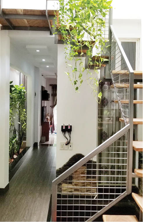 Pampering his wife, Tran Quang Hiep bought a lot of betels and let them climb on the wall connecting the living room and the kitchen. In terms of the skylight, a Vernonia elliptica tree is grown because this kind of plant can grow easily with just adequate water, lighting, and air circulation. Hiep chose this tree to guard the skylight and front fence. Nearby the kitchen, a small pot of honeysuckle is a perfect green-additional option for the kitchen space.