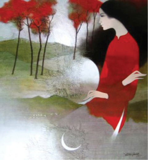 A distinct feature of his paintings about young ladies and flowers is that he uses a “ton sur ton” style, a combination of different shades of a single color, that easily arouses emotions in the viewer. Color tones in the works of this genre are quite abundant, from dreamy pale violet to fiery red, cool green and autumn-filled yellow. Some paintings of young ladies also have the image of far old boats that seem to come from the painter’s memories, and the arches in Hue Citadel also appear from behind the layers of colors.