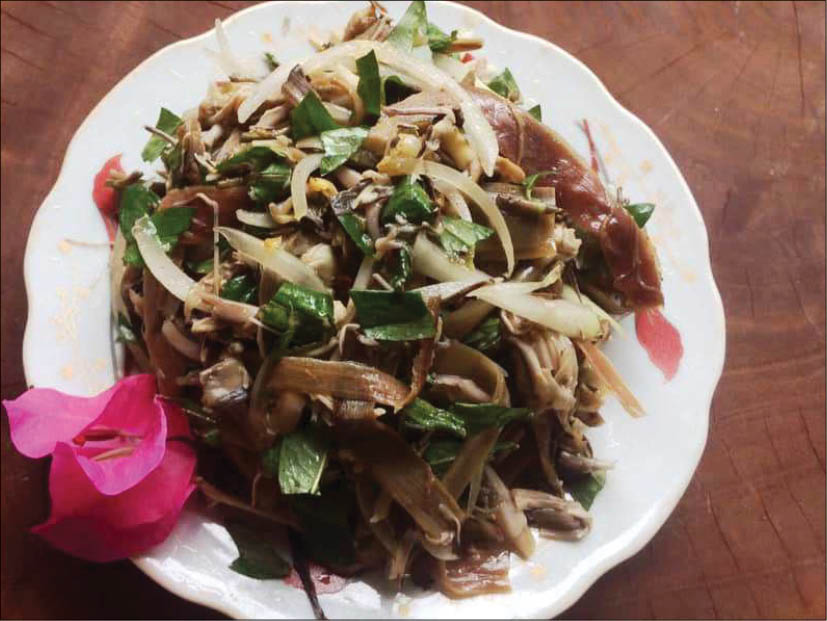 Mom used a little salt, some fish sauce, a bit of scraped sugar from sugar pie to season the banana flower then mixed them well. Back then, we couldn’t afford MSG, so such spice was completely absent in my memory.