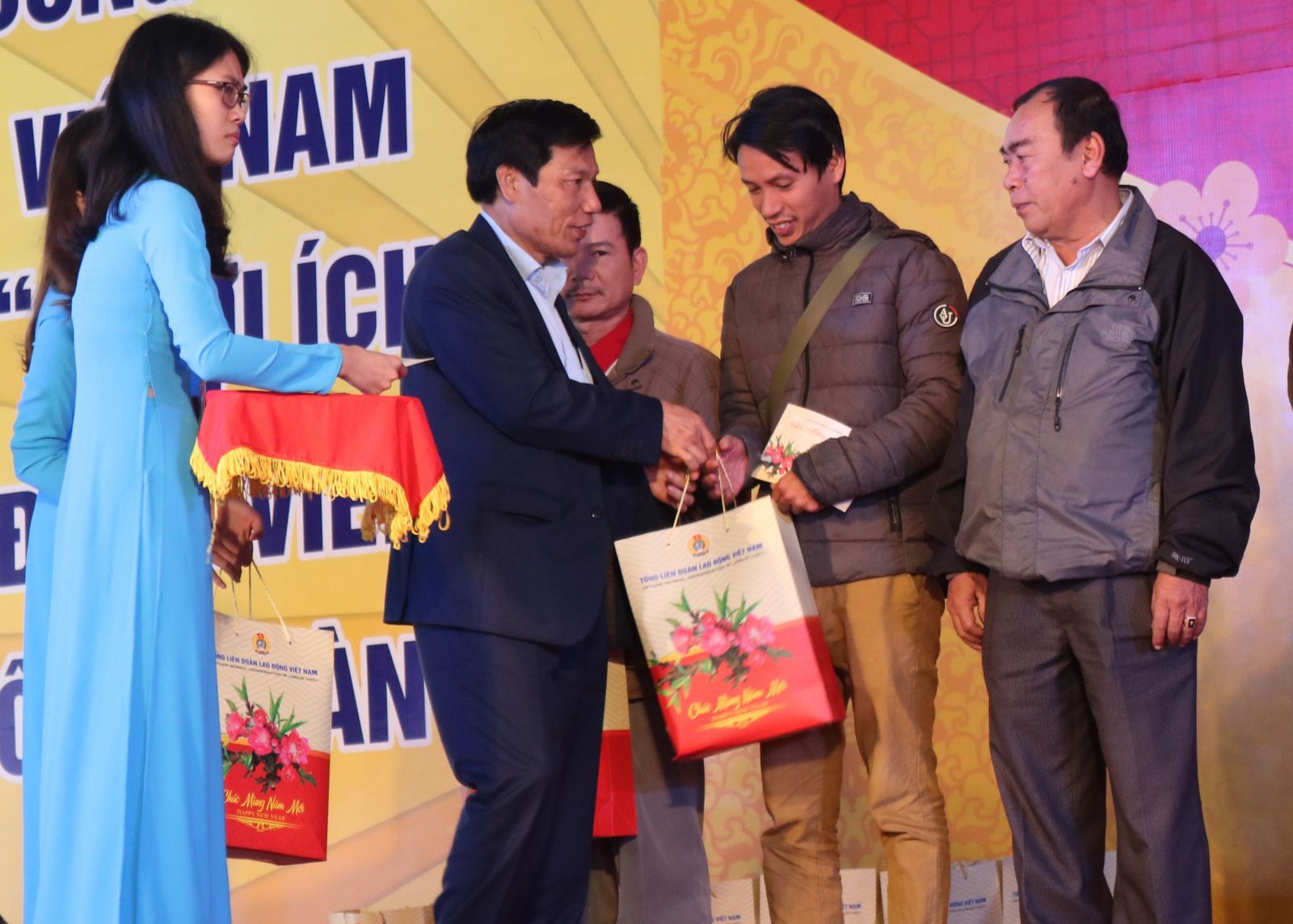Mr. Nguyen Ngoc Thien, Minister of Culture, Sports and Tourism presenting gifts to workers in difficult circumstances in the program "Reunion in Tet holiday" in 2019