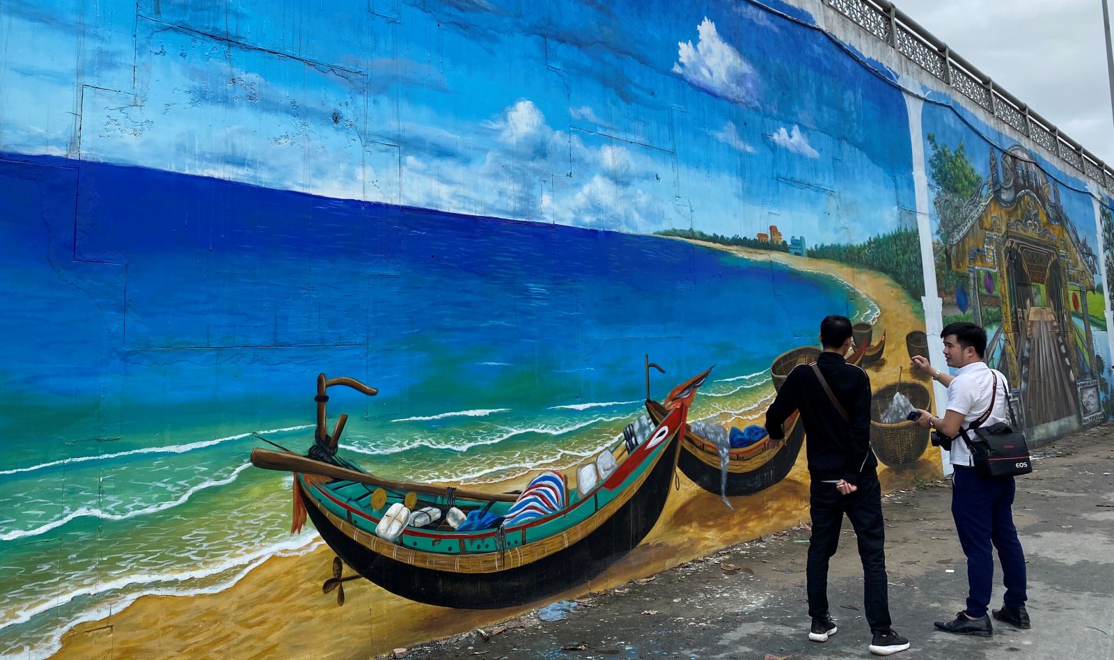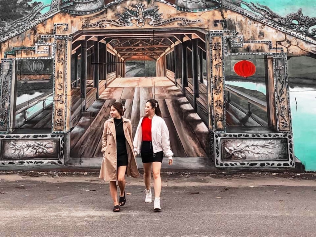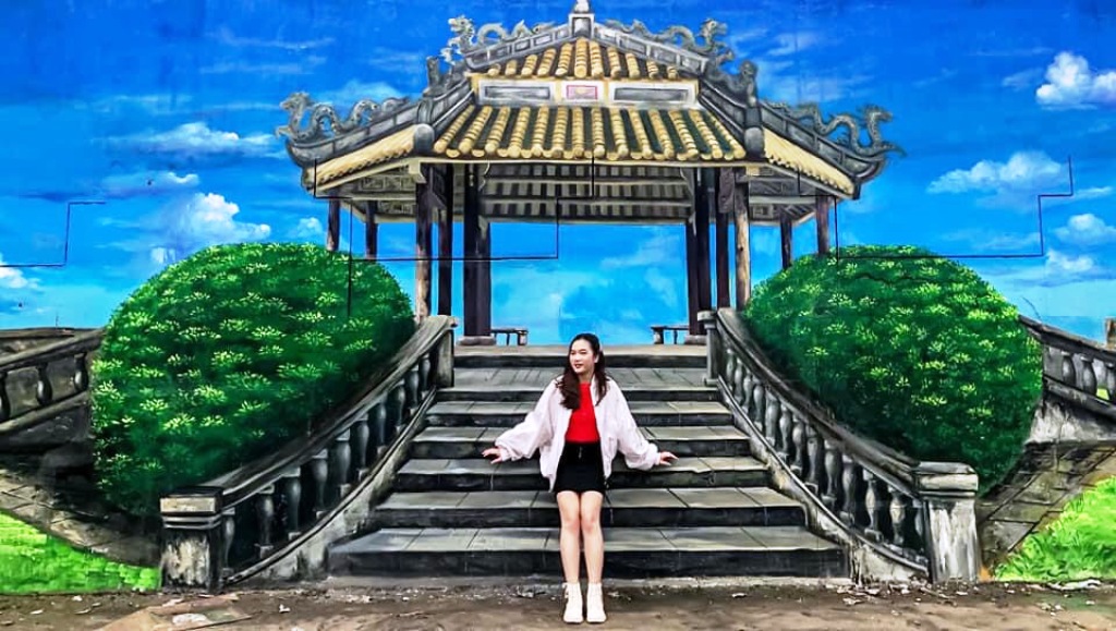 There are 14 mural paintings drawn on both sides of Dinh Market Bridge’s foot, which are famous places in Hue such as Phu Dien Cham Tower, Thuan An Beach, Thanh Toan Tiled-roof Bridge, Thien Mu Pagoda, An Dinh Palace, etc., with a total area of about 750m2.