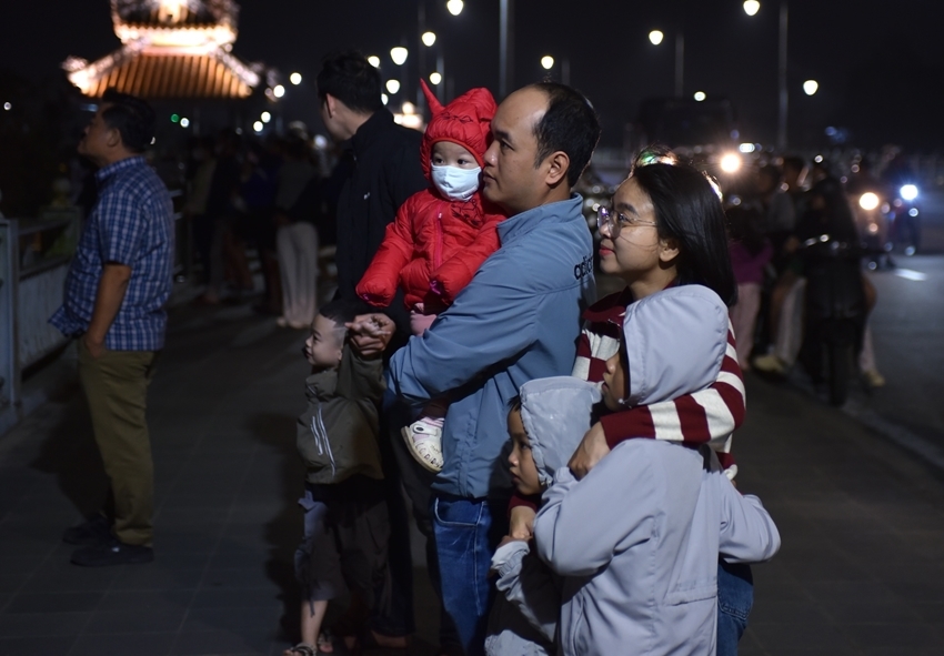 | A family watching the fireworks from Da Vien Bridge |