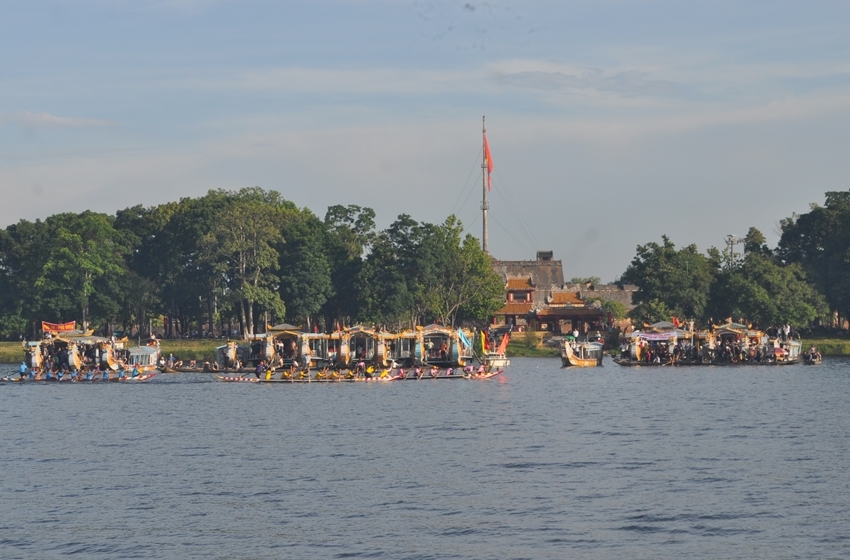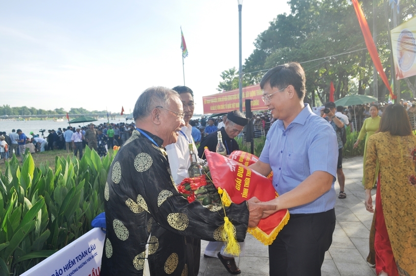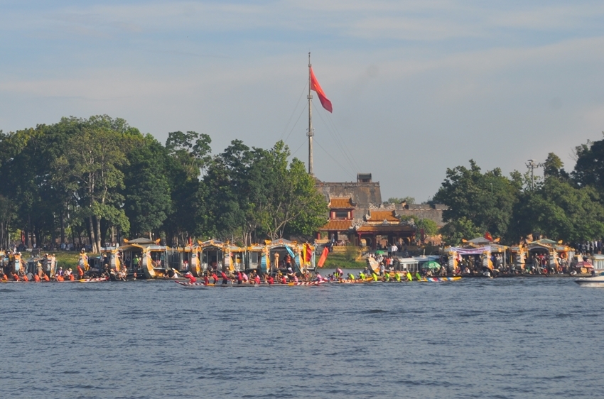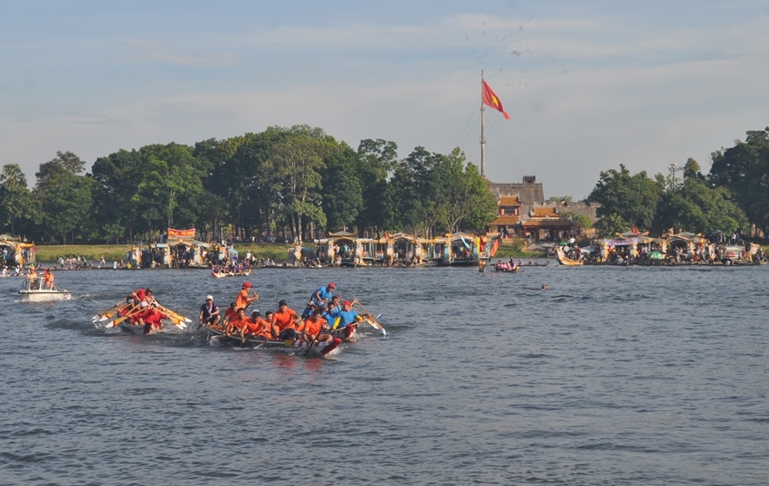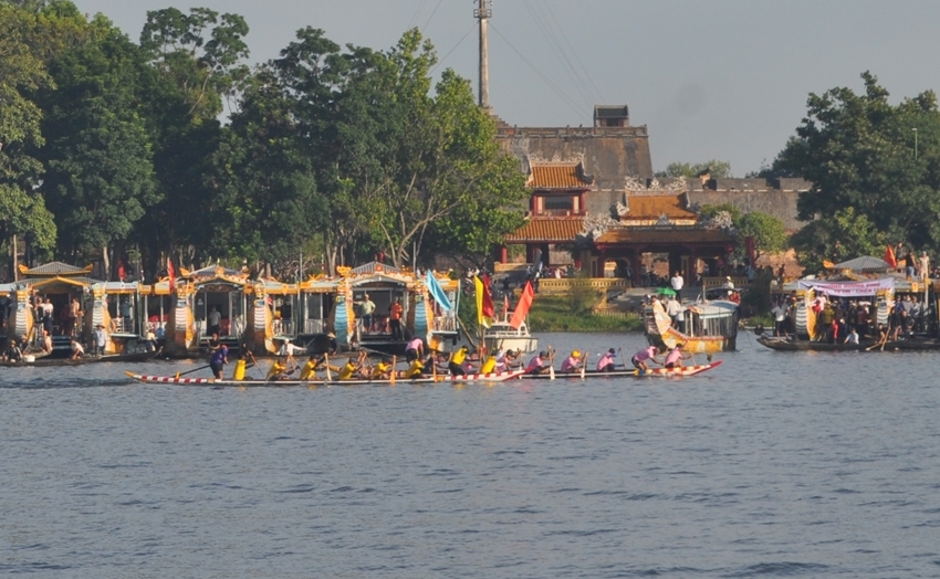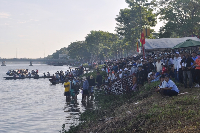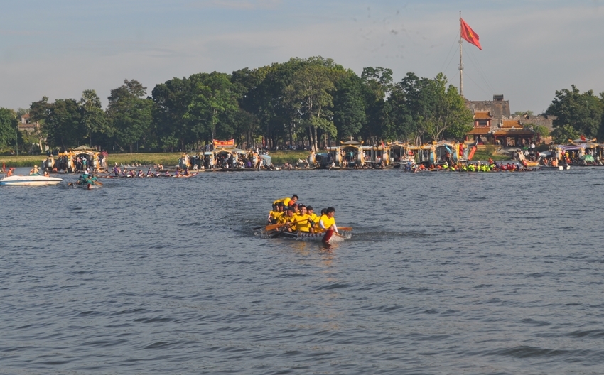 This year's boat racing competition took place at a location on the poetic Huong River, in front of Hai Ba Trung High School. Organizing this competition is also an opportunity to promote and develop local tourism, services, cuisine, and trade during the holiday.