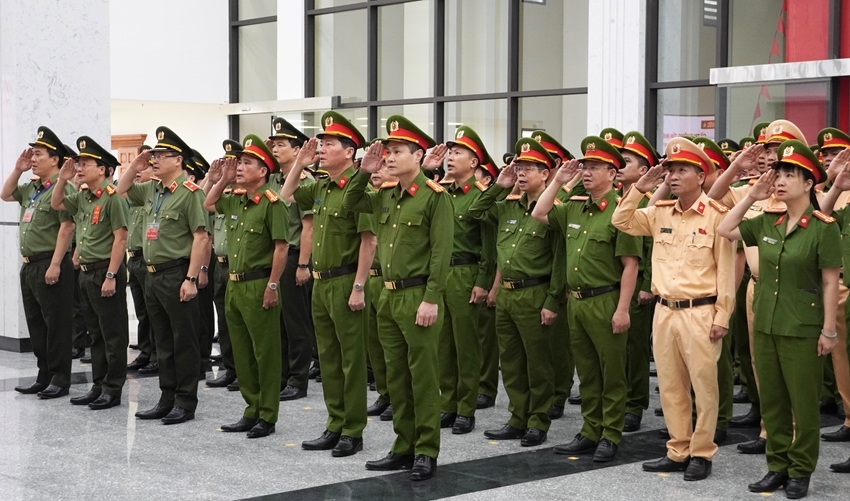 | Officers and soldiers of Hue City Police performed the flag-raising ceremony at the opening ceremony of the election at Polling Station No. 21 (the City Police). Photo: Minh Nguyen |