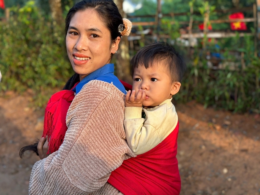 | Voter Vien Thi Sac, 29 years old, a Ta Oi ethnic minority woman, carried her child while going to vote in A Luoi 2 Commune. Photo: Nguyen Khanh |