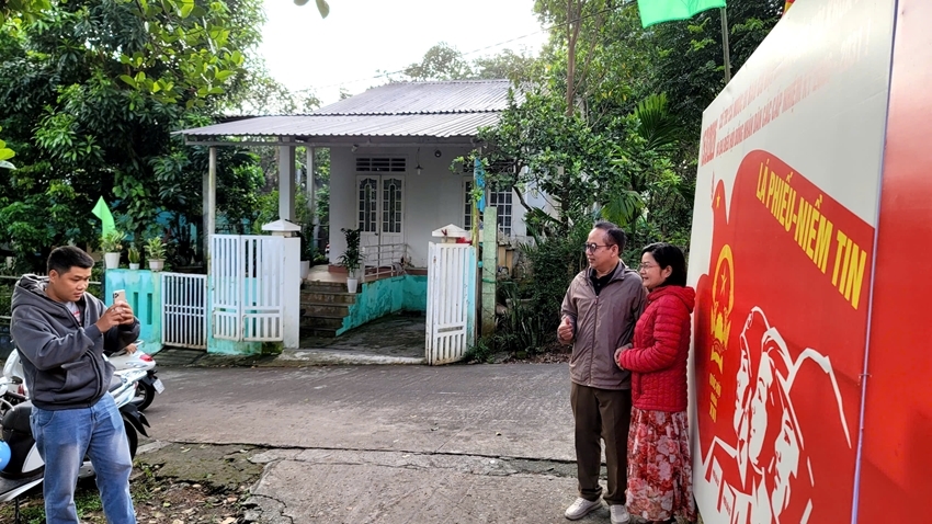 | Mrs. Thuy Van and her husband, residents at 9 Son Xuyen, Residential Group 10, Thuy Xuan Ward, posed for a commemorative photo after voting. Photo: Hoai Thuong |