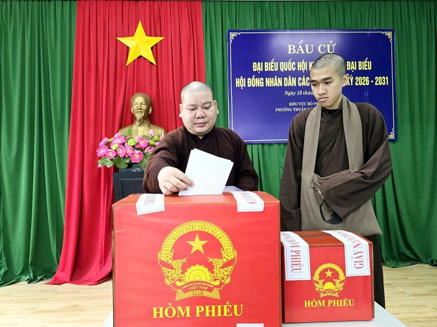| Buddhist monks, nuns, and followers participated in voting at Polling Station No. 37, Thuan Hoa Ward. Photo: Thanh Huong |