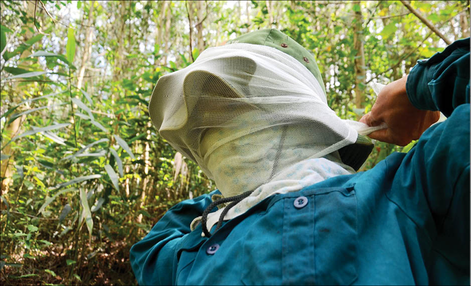 Following the forest honey harvesters, it took about 15 minutes by motorbike to go from the People's Committee of Duong Hoa Commune (Huong Thuy Town) to the acacia and melaleuca/cajuput forests in the Bay Mo area. That was just to the edge of the forest. To go to the area that honey bees build hives, the honey harvesters must hike across streams and hills for an hour. From this area, they spread out in many directions. Some went deeper into the forest. As they walked, they carefully watched the streamlet under their feet; their hands clasped to block the sun rays as they looked up to the tree tops.