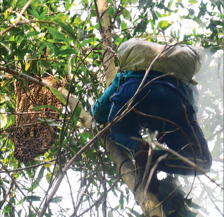 Honeybees often nest near the streams. “Bees ‘landing’ on the water (drinking water) is a signal that a hive is nearby,” said Luyen as he watched the black and yellow striped honey bee as large as the tip of his little finger flying round in the dazzling sun after having a drink. I was about to ask him a question when he quickly grabbed the carry basket. His eyes looked towards the tree tops as he hurriedly followed the bee despite the forest vines and thorns constantly hitting and dangling onto his body.