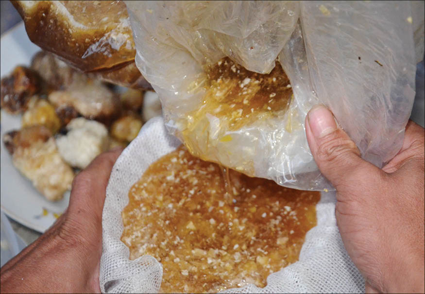 At 5 o'clock, Lai and Lien came home. Both were pretty happy with the honey they harvested. “In season, harvesting this much is normal for a day’s work. But usually, at the same time in previous years, this is supposed to be the rainy season. The bees stay in Laos. So, harvesting 4 liters of honey now is really good already,” Lien said while quickly squeezing out all the honey and taking the remaining clumps of honeycomb to soak in alcohol.