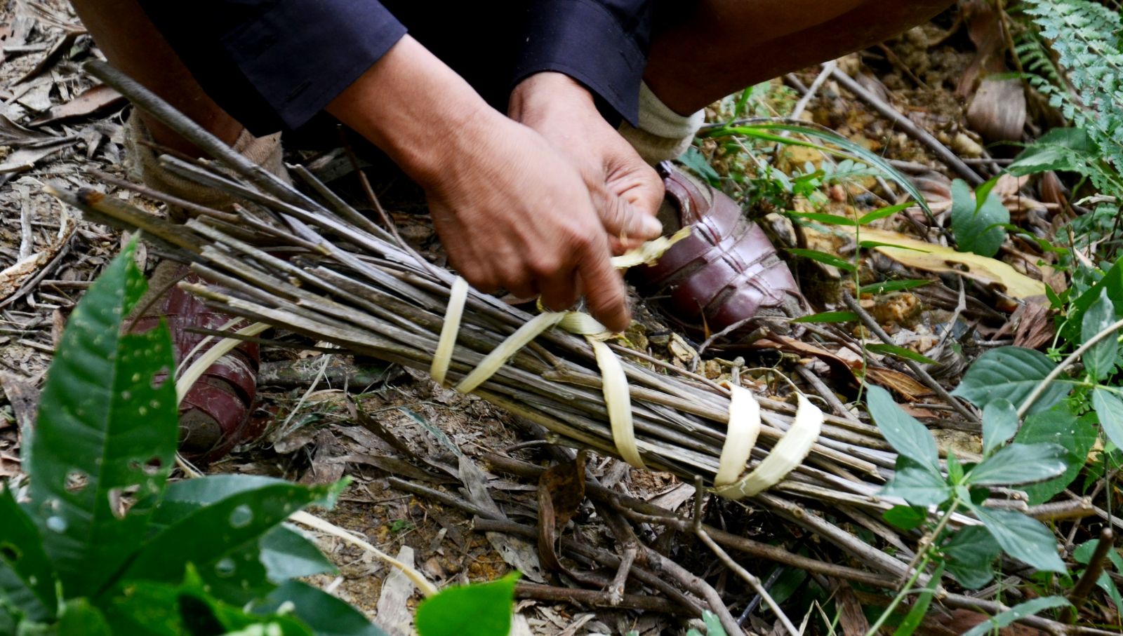Then, Luyen and Neo found vines to tie together dry branches and cover with fresh leaves. They braided it into the torch with a hook on the top. “The fire from dry leaves and branches will burn the fresh leaves, creating smoke. The smoke will chase away the bees. The hook will attach the torch to the tree branch while we harvest the honey,” Neo explained.