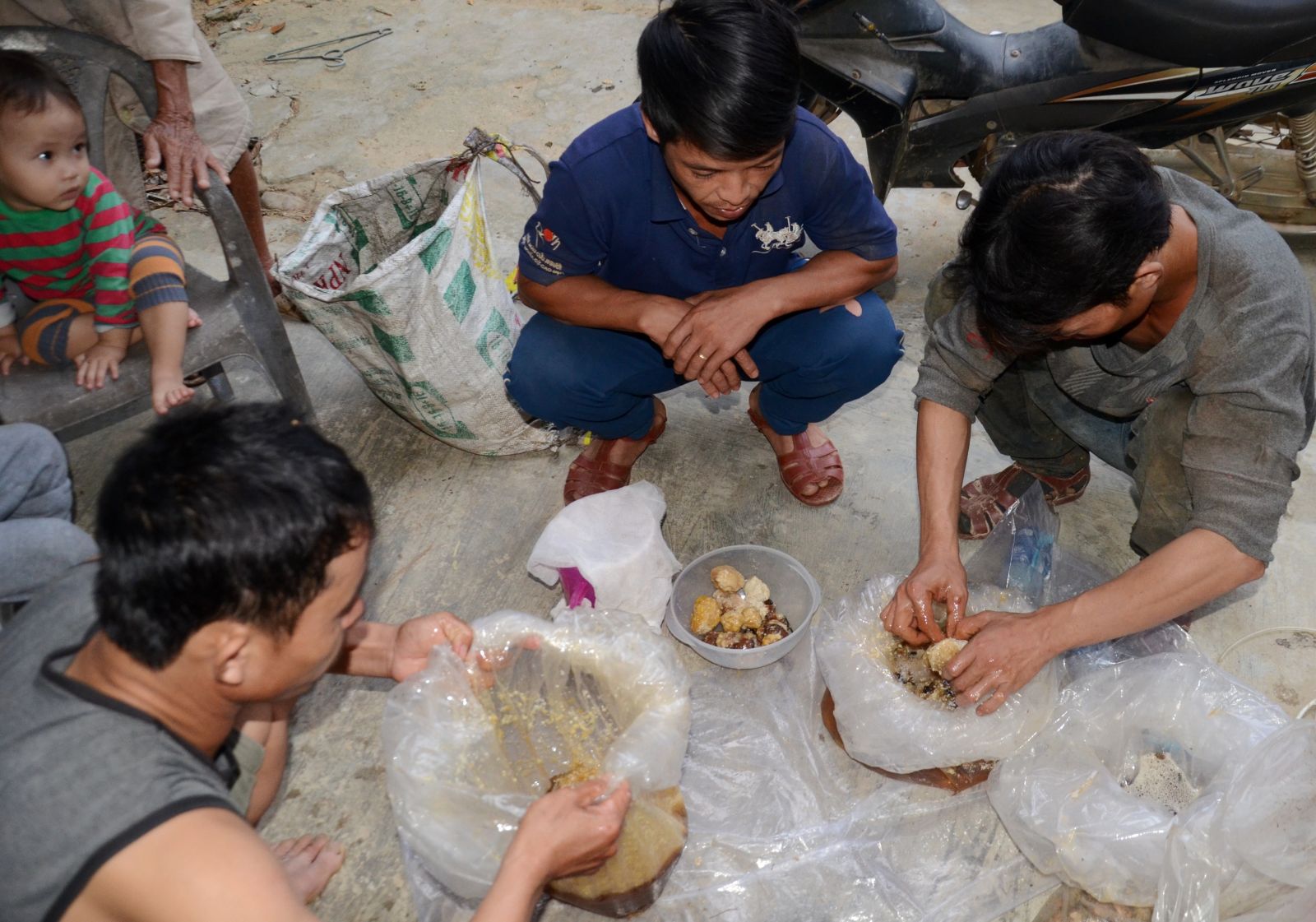 Eyes on the top of the tree, even though the mesh over his face was now covered black with bees, Luyen calmly used his hand to tear the lower layer (where young bees nest). Then, he used his knife to cut the honeycomb into the plastic bag and quickly climbed down. After carefully extinguishing the torch in the nearby stream, Luyen laughed: “This is around 1 liter. It’s almost dark now. Let’s go home. If it is clear tomorrow, we’ll go deeper in the natural forest. Chances are better there.”