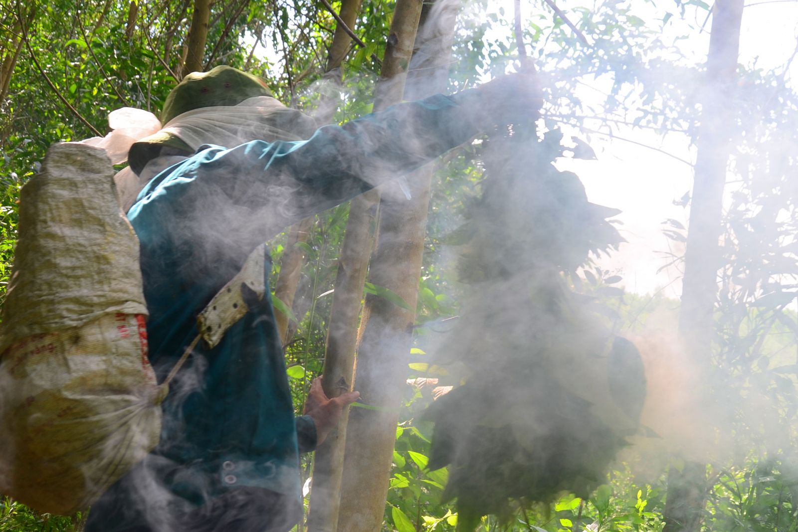 The contents in the carry basket were taken out. After a few minutes, Luyen was covered from head to toe. He held the smoking torch in one hand. Like a squirrel, he quickly climbed the tree and got close to the hive, ignoring the weight of his body on the bending branch. After a while, the smoke got into the hive. Thousands of bees swarmed out creating a black cloud. At this moment, Neo pulled his reporter companion who was still immersed with the camera below to a large tree that was quite far away and made a notion to stay still: “A couple of bee stings are manageable but a few hundred or thousand bees attacking us would be a big problem.”