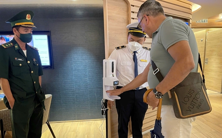 | Hue City Center for Disease Control checking the body temperature of foreign visitors using remote devices after a cruise ship docks at Chan May Port |