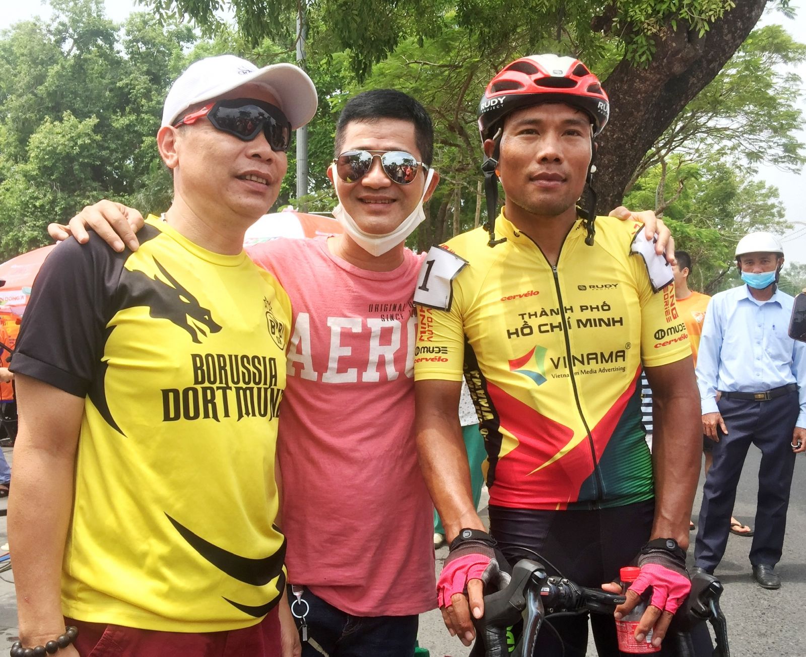 Racing cyclist Nguyen Truong Tai (the right end) having photos taken with Hue fans