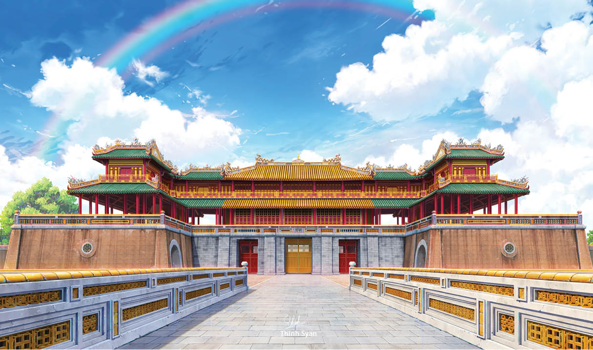 The image of Ngo Mon Gate - the Meridian or Noon Gate, (Hue Imperial Citadel) was selected for the anime drawing not only because this is a typical large-scale work, but also because the admiration of this work from different angles has helped Quang Thinh shape more ideas to draw the complementary surrounding scenery. This helps Ngo Mon Gate stand out in the drawing, while still ensuring the principles of general layout, golden ratio, and shadowing.