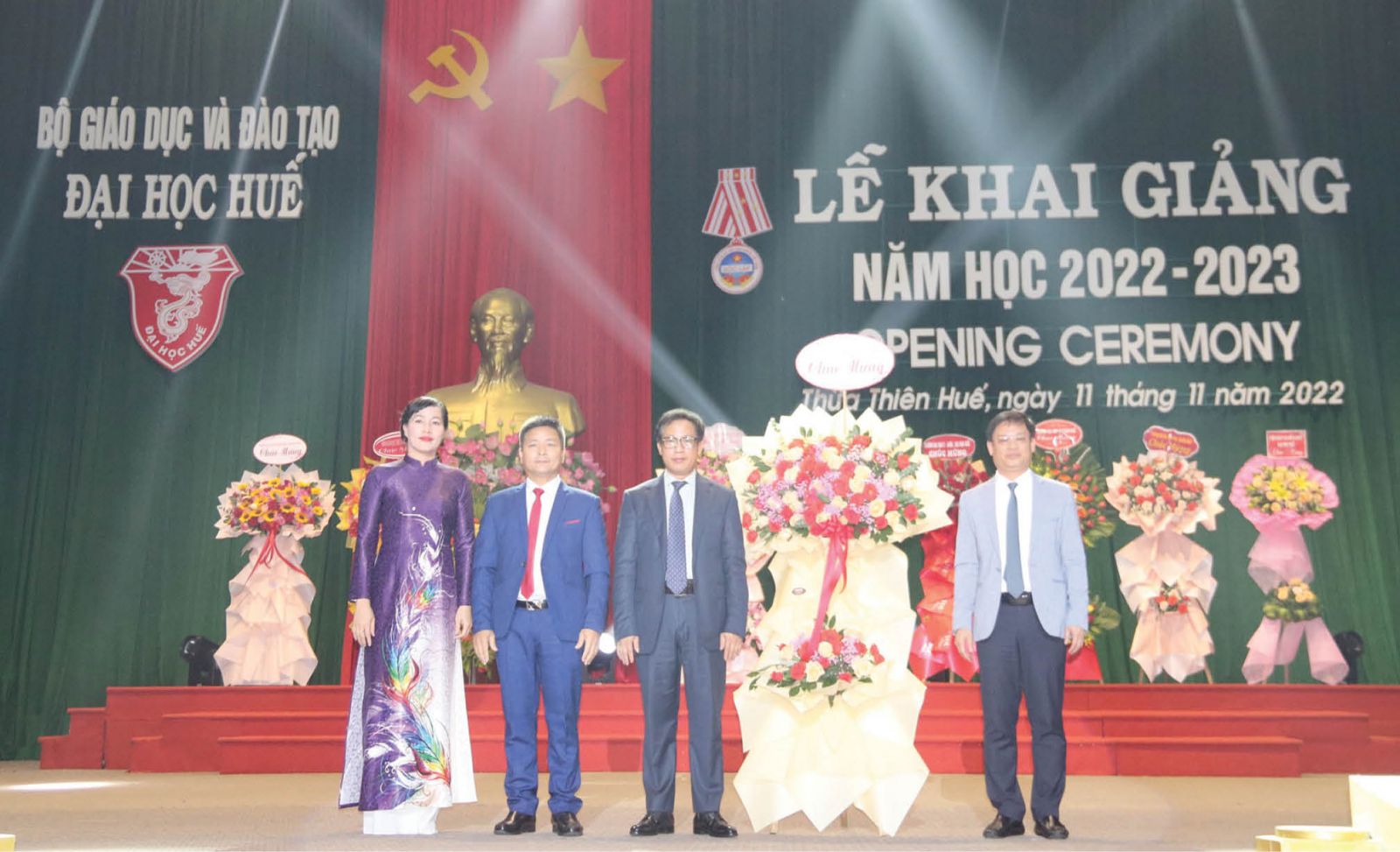 Standing Vice Chairman of the Provincial People's Committee Nguyen Thanh Binh (on the right) presenting flowers to congratulate Hue University's achievements