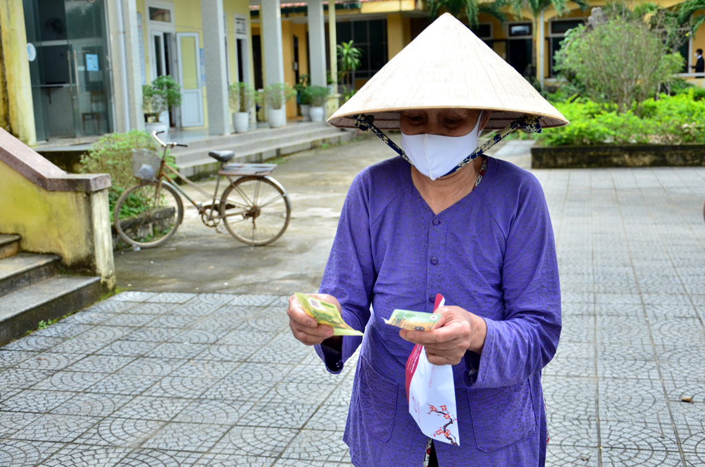 Holding the cash in her hands, Mrs. Nguyen Thi Xoa from Phong Xuan Commune emotionally shared that her husband and herself were over 90 years old then, and they had to rely on each other. With that money, she will buy rice and other items to offer to ancestors during the upcoming Tet holiday.