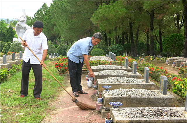 With Thong, Minh, or Sinh, the joy of the job is simply to see incense lit up for the deceased, the cemetery grounds tidied, and trees pruned neatly. Accompanied by these caretakers, the graves of heroic martyrs are no longer lonely. Strangers as they are to each other, from deep inside, the maintenance staffs think of the martyrs as their relatives.