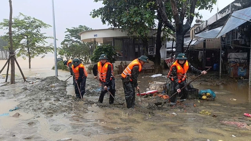 As floodwaters began to recede on the morning of October 31st, Division 968 mobilized 500 officers and soldiers, along with vehicles and logistics equipment, to affected areas where they collaborated with local authorities and on-site forces to clean up debris and restore sanitation after severe floods.