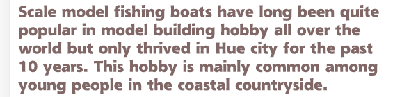 When in Thuan An town, it is not difficult to ask about model fishing boats because many young people own model boats customized to their likings, from the gillnetters to seiners and vessels made up of steel or composite hulls. A model fishing vessel is about 1m long, weighs approximately 10kg, and reaches a speed of 20-40km/h on water.