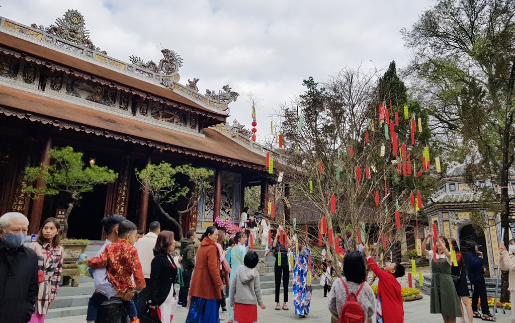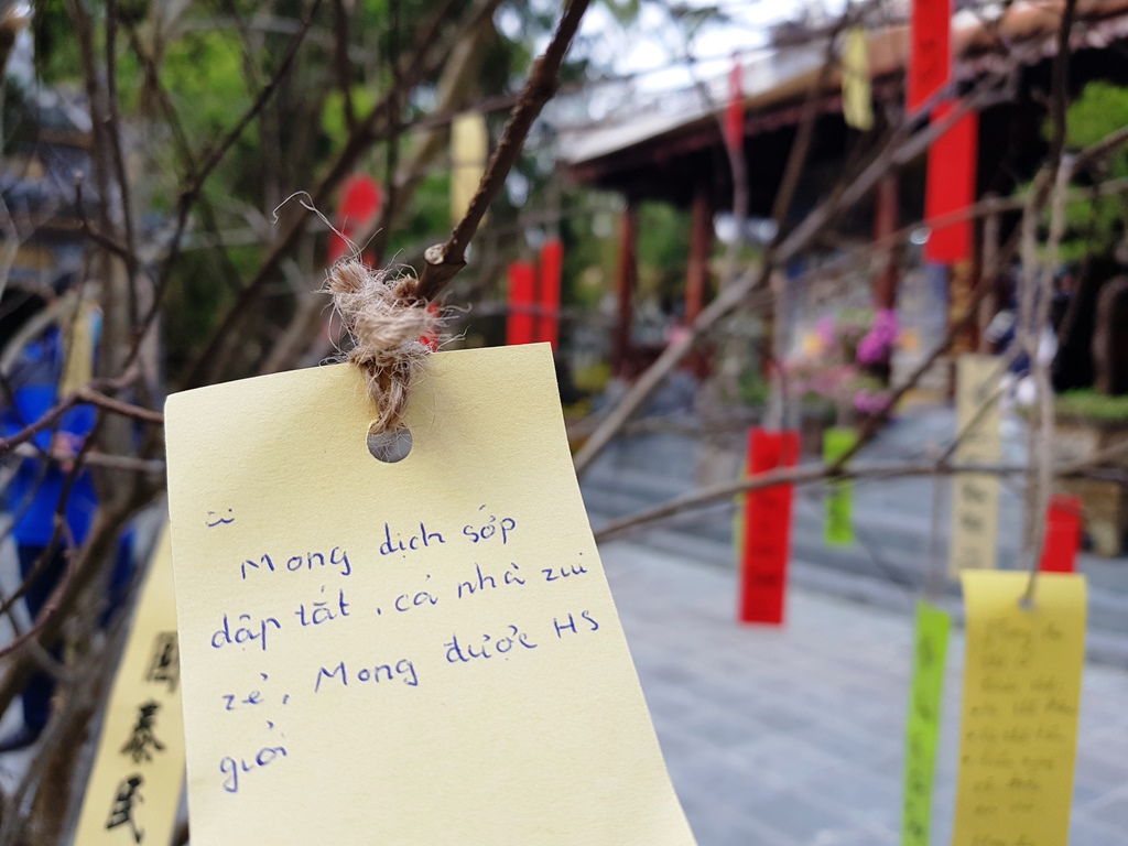 At many famous ancestral and ancient pagodas of Hue such as Tu Dam, Thien Mu, Tu Hieu, Thuyen Ton, etc., people unhurriedly came to offer incense and worship Buddha from very early. They picked up a piece of paper, wrote down their wishes and then hung on a tree erected in front of the main hall. The elderly wished for peace and luck, young children wished for good academic results, and middle-aged people wished for favorable work. The majority of people have the common wish that the pandemic will quickly end, and everyone stays healthy.