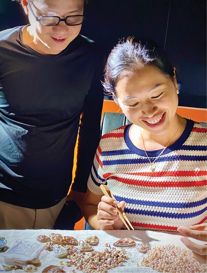 | Pham Duc Bang and Truong Thi My Dung check the quality of pearls |