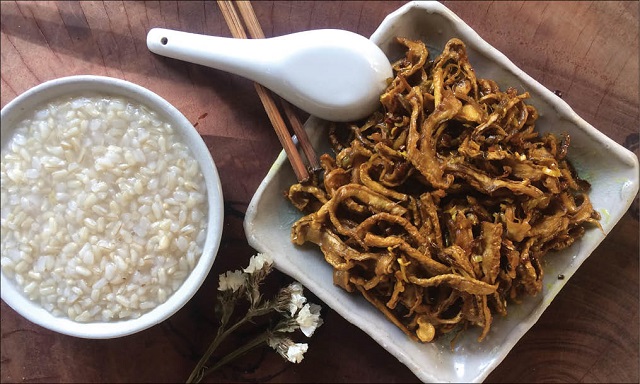 Besides rice, simmered dried daikon radish with galangal and lemongrass goes perfectly well with porridge.