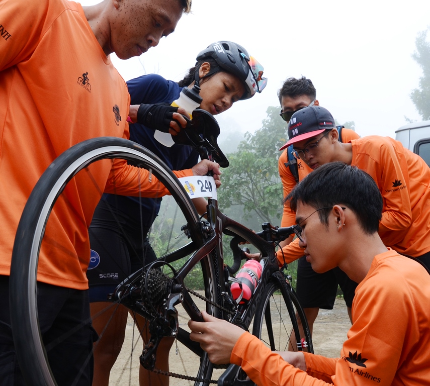 A racer of Huong Thuy Town had to stop at the rest point to receive care from the volunteers