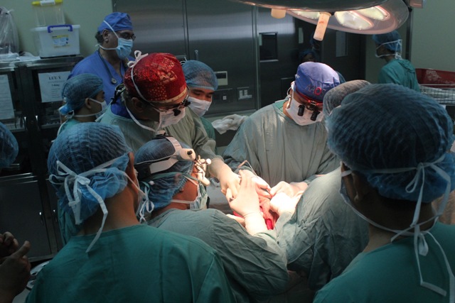 8:30 am, October 18, the operation for N. was performed by: Dr. Le Thua Trung Hau and the staff of Plastic-Reconstructive and Hand Surgery Dept., Neurosurgery Dept., Anesthesiology Dept., especially with the help of Professors from Stanford University (US) in cutting cranial bones, lacrimal bones and maxilla bone, removing frontal and nasal bones, then bringing 2 orbital fossa back to their normal position. Finally, surgeons used splints to stabilize cranial and maxilla bones. The operation ended at 16:30 on the same day.