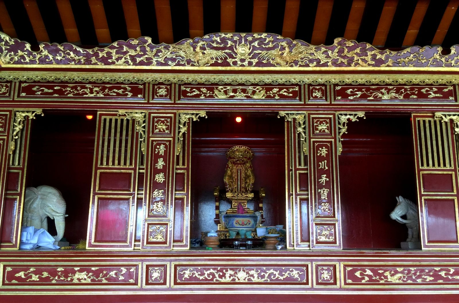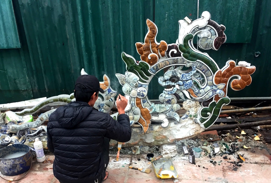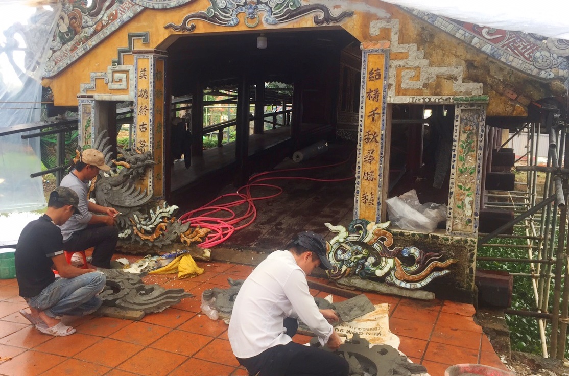 After assessing the current status of wooden structures in accordance with the standards, regulations and principles of conservation, the construction unit undertook to renovate and restore the system of flooring and the main frame structures made of ironwood (columns, trusses, crosses, railings, sitting platforms...); to restore the Thanh Luu Ly enamel tube roofing system; and to decorate the system of roof, eaves, compartments and ridges with mounted porcelain and etc. according to traditional technology.