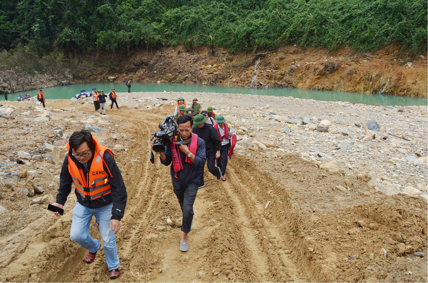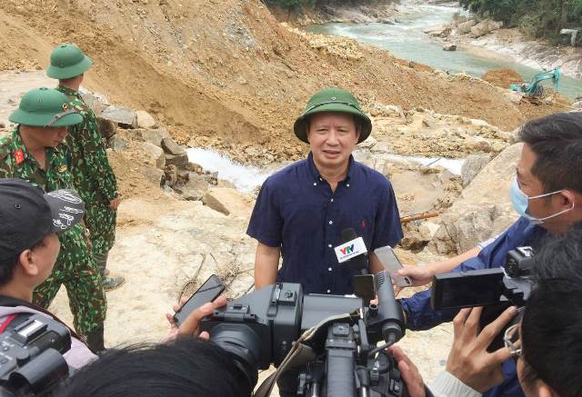 Reporters of press agencies interviewing Secretary of the Provincial Party Committee Le Truong Luu at the search area for missing victims at Rao Trang 3 Hydroelectric Power Plant.