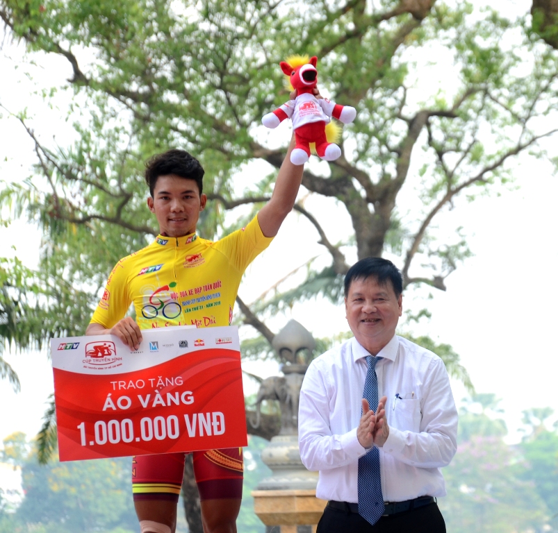 Vice Chairman Nguyen Dung presented a yellow shirt to the winner of the third leg of the race: Dong Hoi - Hue before starting stage 4