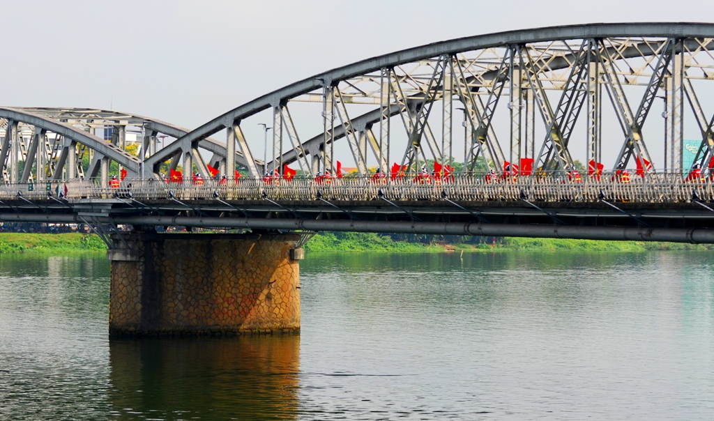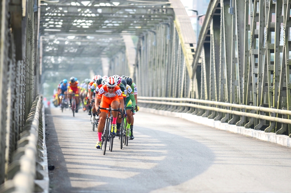 Cyclistss leisurely rode on the historic Truong Tien Bridge in the "prelude" round