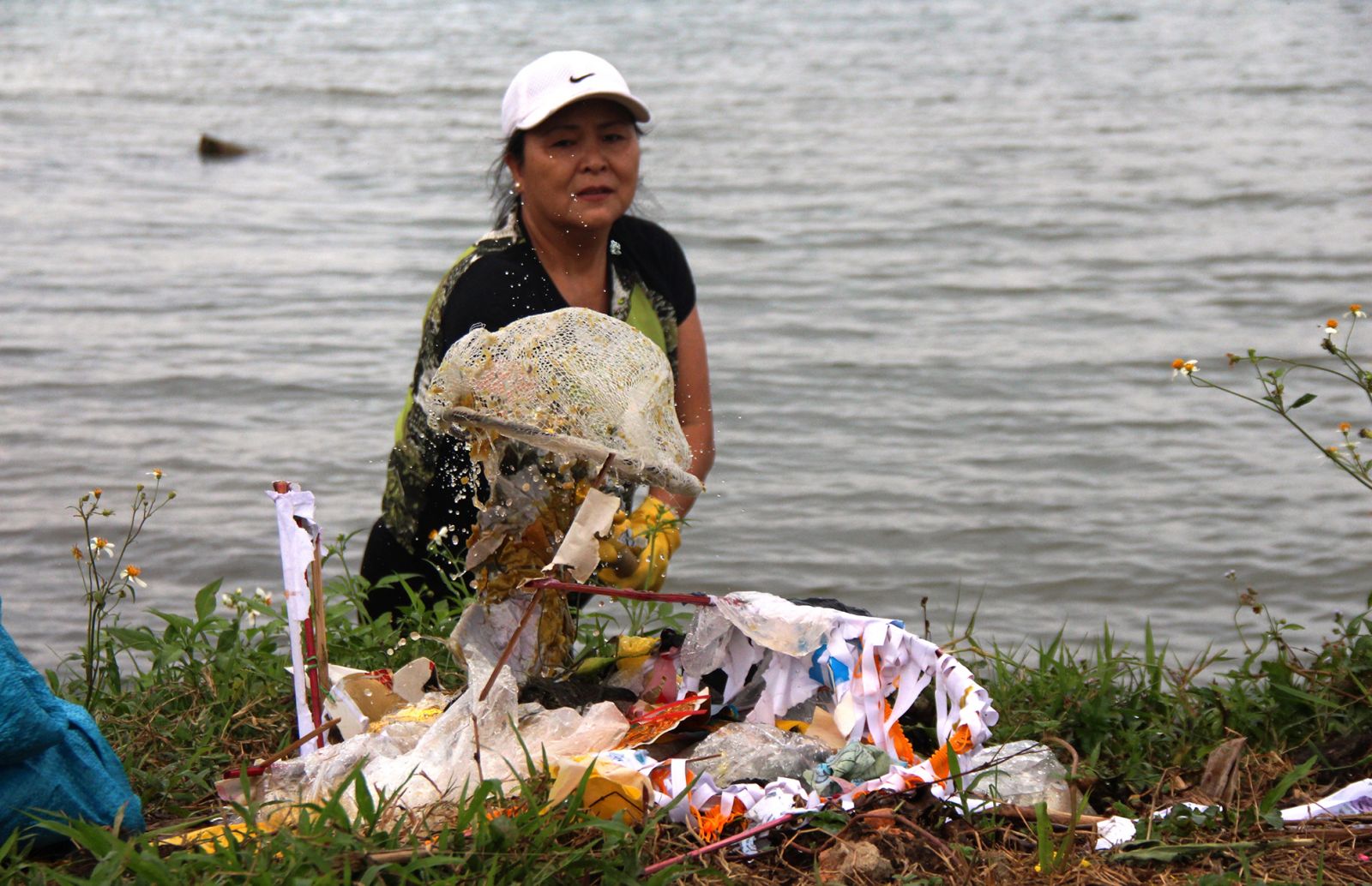 arbage such as plastic bags, votive paper, plastic packaging, or water fern were floating on the water before being picked up and dragged ashore by these women with their soft hands. “We go out here every afternoon to watch the river. And it hurts to see this. If we don’t take action, whom should we turn to?”. These women, old or young, share a sincere love for the romantic river.