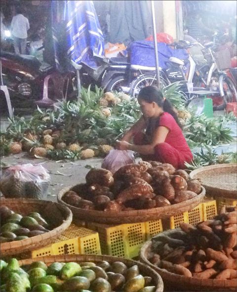 Walking into the market, I had to acknowledge that even though I had stayed in Hue for a long time, it was my first time going to a night market. It was so wide, with a great variety of goods that I exclaimed in surprise; the market was too big compared to the one in my hometown. The sound from lively exchanges of goods, the dazzling faces lightening up in the night, the merchants from far away gathering to sell goods, etc. created a vigorous atmosphere on the hot night of Hue. The stalls were packed with colorful patches of tapioca, carrots, tomatoes, pumpkins, yams, vegetables, etc. as though they were the embodiment of the tropical agriculture right here in this market.