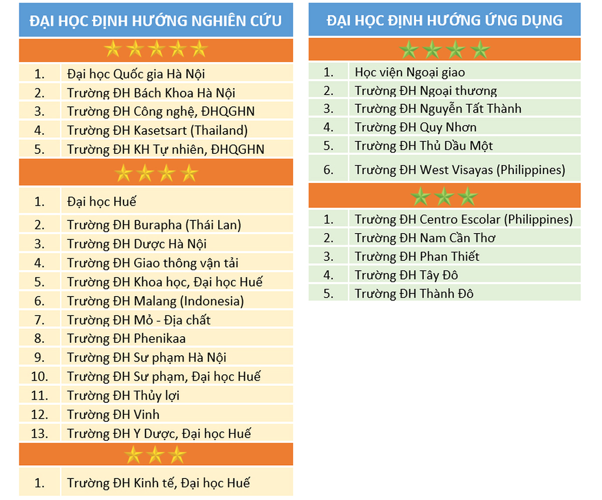 In addition, a number of application-oriented universities also meet the four-star standard, including Foreign Trade University, Diplomatic Academy of Vietnam, Thu Dau Mot University, Quy Nhon University, Nguyen Tat Thanh University, and West Visayas University (the Philippines).