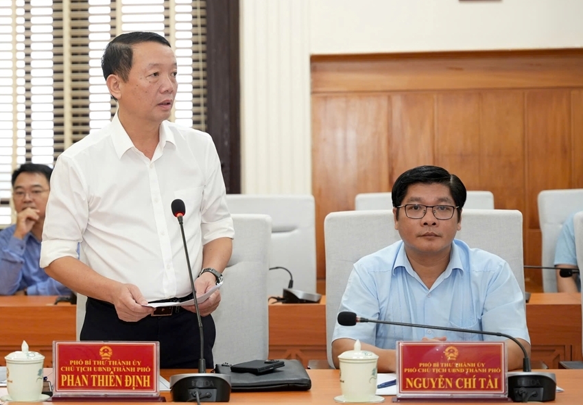 | Chairman of Hue City People’s Committee Phan Thien Dinh presenting his recommendations at the meeting |