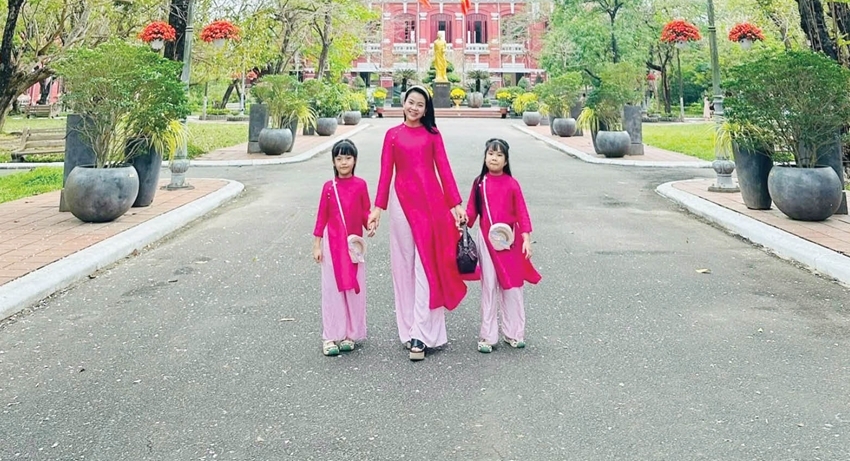 During the recent Lunar New Year (Tet), Ms. Doan Thuy Ha (from Vy Da Ward) chose the traditional Hue Ao-dai as the spring outing outfit for herself and her two children.