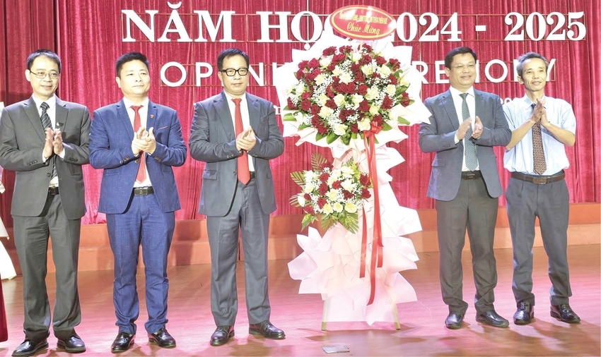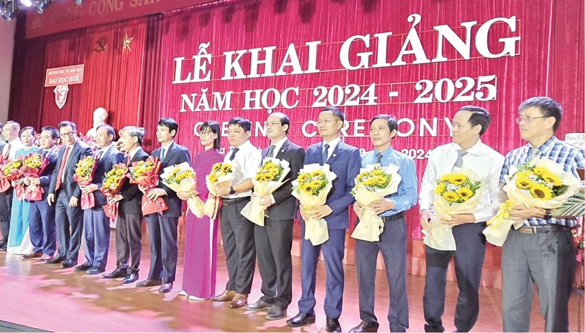 | Provincial leaders presented flowers to congratulate Hue University at the opening ceremony of the new academic year |