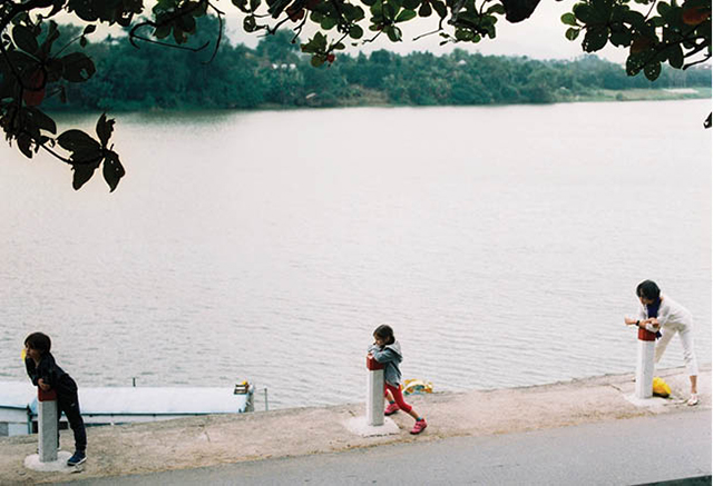 Children playing by the river, taken with a film camera.