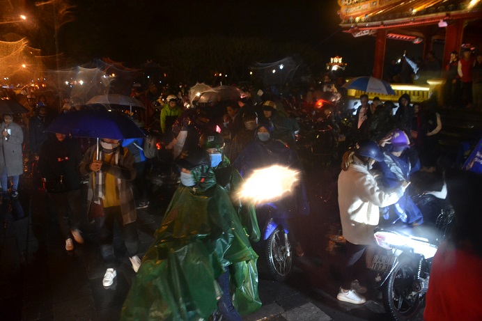 Although the weather in Hue was cold and rainy at the time of shooting the cannons, thousands of people and tourists still went to Phu Van Lau and Flag Tower areas to watch and wish each other a happy new year.