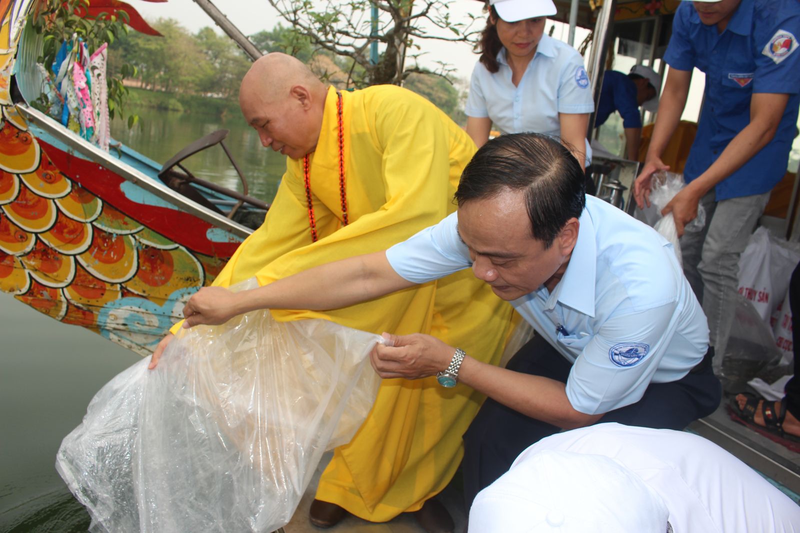 After the launching ceremony, the representatives of related departments and hundreds of students released over 40 thousand fish in various species (snakeheads, catfishes, carps and dories) into the Huong river. Among them, the government budget granted 12 thousand fish, the Provincial Buddhist Association supported providing over 15 thousand fish; the remaining of over 13 thousand fish was sponsored by the organizations and enterprises.