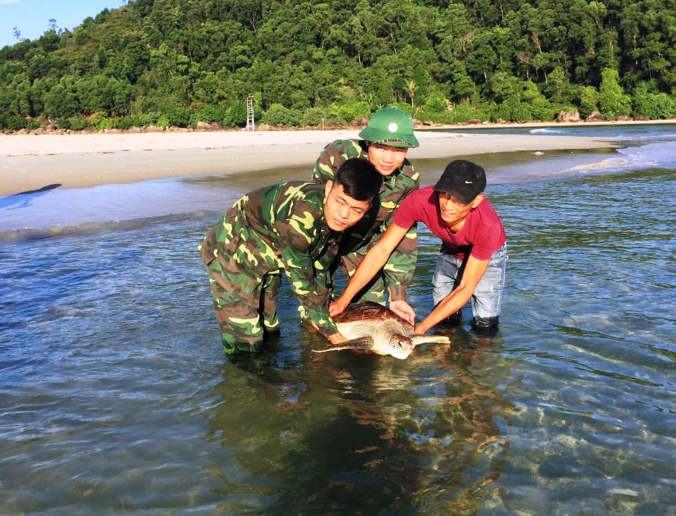 Major Van Le Lam Duc, Political Instructor of Chan May Port Border Guard Station said that earlier, fisherman Phan Thanh Gian, residing in Canh Duong Hamlet (Loc Vinh, Phu Loc), had found the Vich sea turtle weighing 20 kilograms trapped in his fishing net while spreading out the net in the rock rapids area in Loc Vinh Commune.
