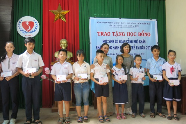 HNN.VN - On the morning of June 6, the Provincial Association for the Support of the Handicapped and Orphans coordinated with Hue Compassionate Arms Club to hold a scholarship awarding ceremony for students in difficult circumstances in the month of humanitarian action for children 2019.