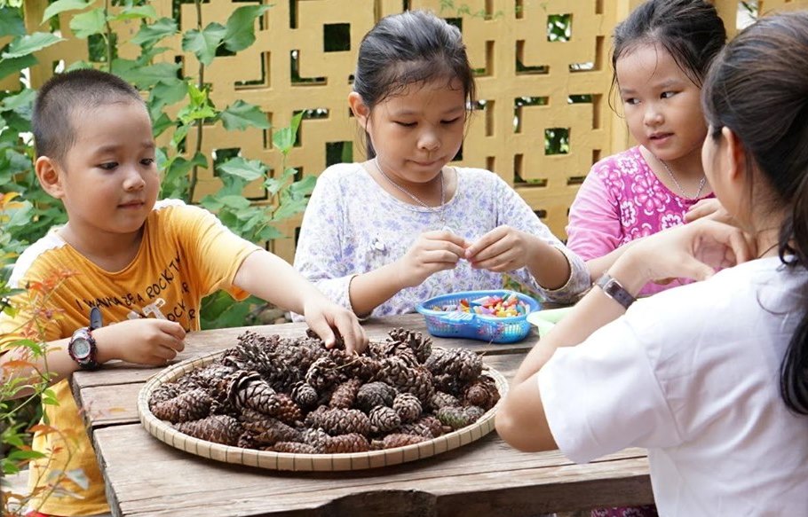 On this occasion, the children also had a chance to discover the world of autistic children through the painting exhibition with the theme "Touching the Dream". The exhibition showcased 20 paintings of a boy named Dong Hung. He drew on things he felt about life such as landscapes, temples, tombs, and recreational activities of children.