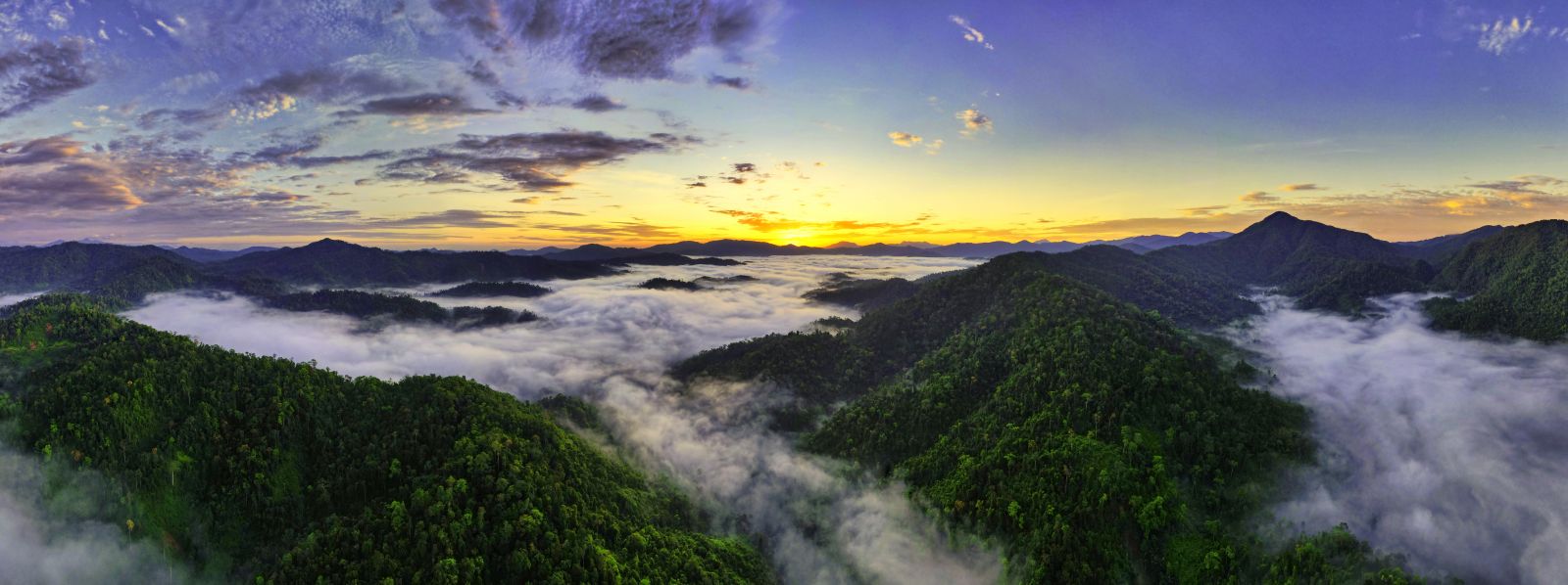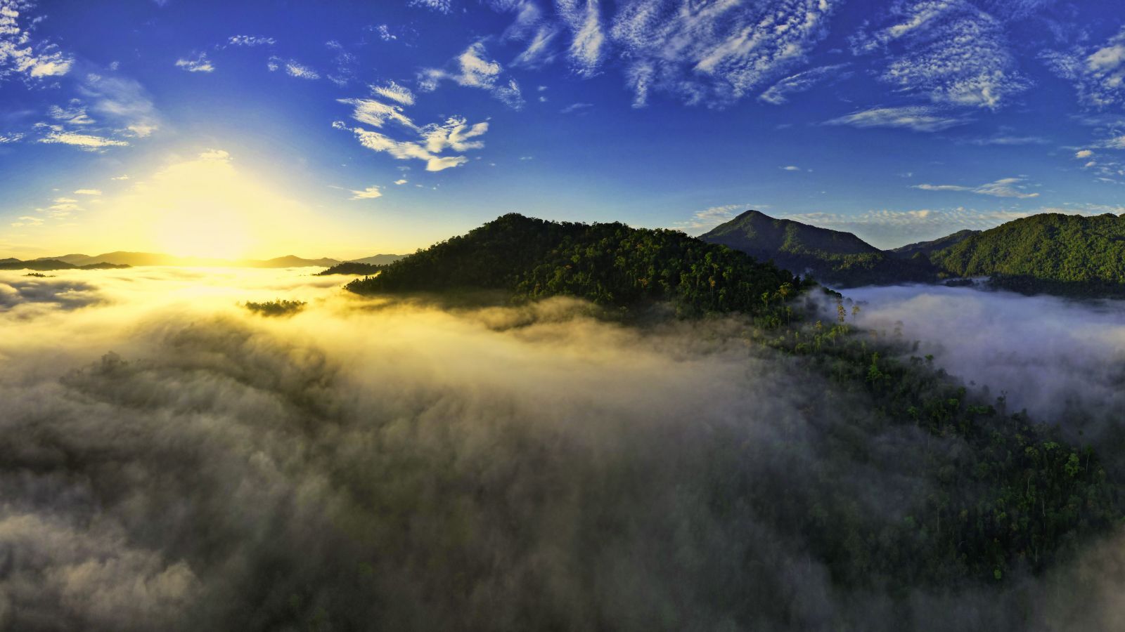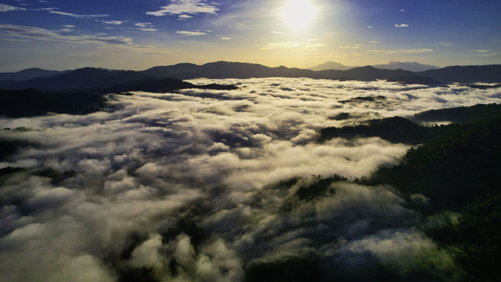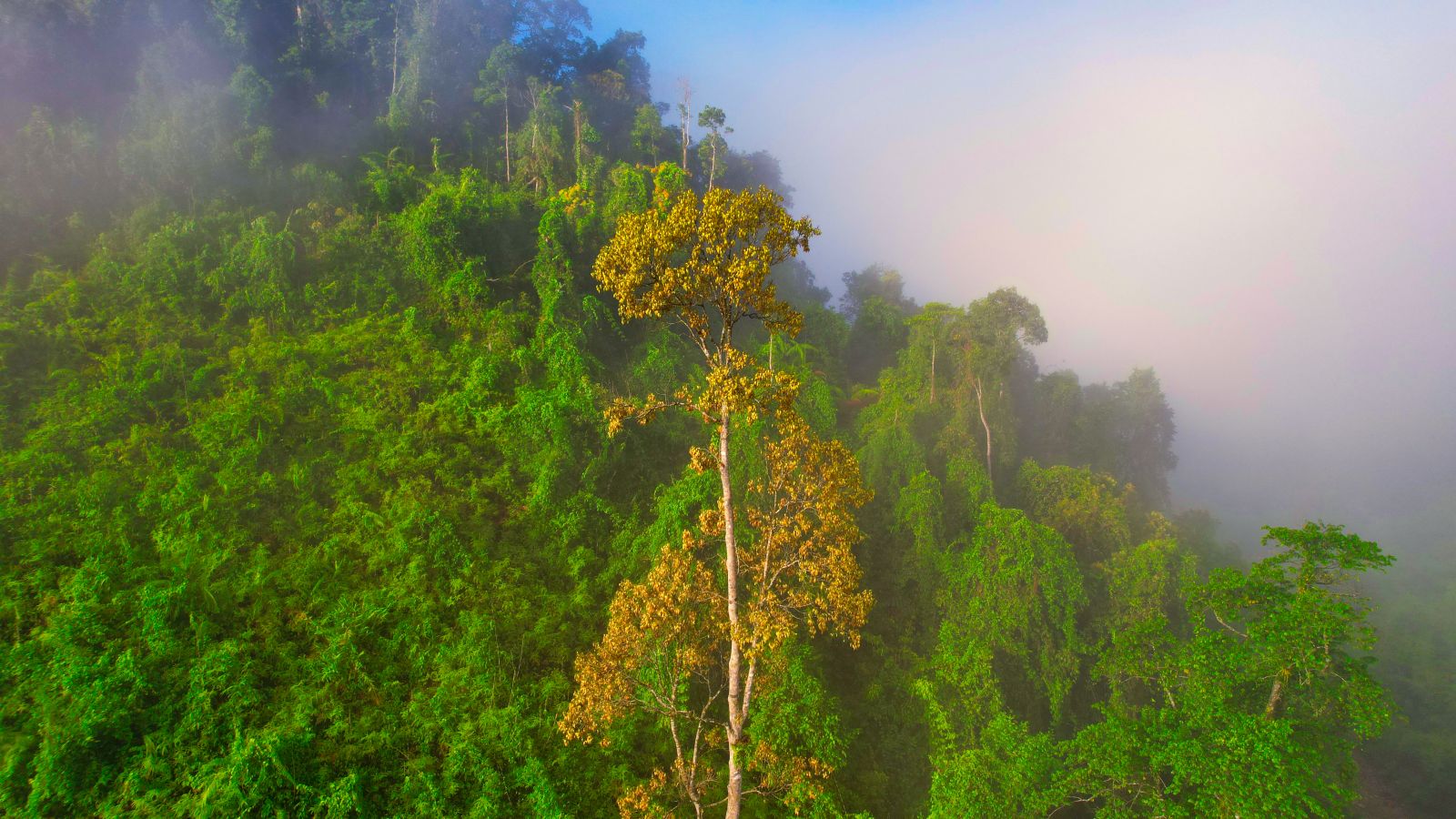 The sea of clouds is gradually scattered as the sun is high, and far to the right is the scaphium macropodum forest bearing fruit